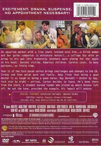 | An aquarium worker with a live shark latched onto him...a blind woman and her guide companion (a miniature horse!)...a college boy with an arrow in his gut (his fraternity brothers were aiming for the apple on his head). Gunshot victims. Homeless children. Cardiac cases. So many patients, so little time.Year 11 of the fast-paced series brings challenges and changes to the ER. Corday and Chen weigh work and family. Abby finds that being a good doctor is as tough as being a good nurse. Ray Barnett — doctor by day, rock star by night — arrives. Carter decides to leave. He's been there from the start, a student turned leader who picked up where Greene left off. He set the tone, provided the example. His impact will endure. |