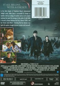 | In the third chapter of Stephanie meyer's phenominal Twilight series, Bella Swan is surrounded by danger as Seattle is hit by a string of murders and an evil vampire cintinues her quest for revenge. In the midst of it all, Bella is forced to choose between her love, Edward Cullen, and her friend, Jacob Black — knowing that her decision may ignite the agless struggle between vampire and werewolf. |