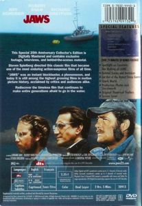| This Special 25th Anniversary Collector's Edition is digitally mastered and contains exclusive footage, interviews, and behind-the-scenes material.Steven Spielberg directed this classic film that became one of the most enduring action-suspense films of all time."Jaws" was an instant blockbuster, a phenomenon, and today it is still among the highest grossing films in motion picture history, acclaimed by critics and audiences alike.Rediscover the timeless film that continues to make entire generations afraid to go in the water. |