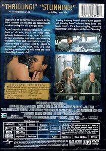 | Dragonfly is an electrifying supernatural thriller full of surprises that will keep you guessing and a knockout ending that will blow you away!Dr. Joe Darrow is a man distraught over the violent death of his wife. But is she really dead? Suddenly, Joe is confronted by a series of haunting messages, impossible coincidences and unsettling encounters. With each supernatural event, Joe becomes more desperate, until he begins to suspect the shocking truth. Now, in a final shattering revelation, he will make the most astonishing discovery of all.Starring Academy Award winner Kevin Costner and featuring Oscar winners Kathy Bates and Linda Hunt, it's a heart-stopping, unearthly thriller NBC's Jeffry Lyons applauds as "Stunning". |