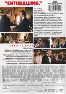 - Deleted Scenes - The Making of Frost/Nixon: Take an in-depth look at all aspects of the production and discover the lengths it took to recreate this historic event for the big screen. - The Real Interview: Footage from the actual interview and how it compares to the way it was reenacted for the film. - The Nixon Library: Discover the materials that have been preserved for public viewing in the Richard Nixon Library, ranging from the "Nixon Tapes" to footage of Nixon visiting China. - Feature Commentary with Director Ron Howard |