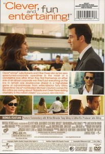 | Oscar® winner* Julia Roberts and Clive Owen star as two sexy spies-turned-corporate operatives in the midst of a clandestine love affair. When they find themselves on either side of an all-out corporate war, they'll put everything on the line to remain one double-cross ahead in a high-stakes game of cat-and-mouse. From writer/director Tony Gilroy (seven-time Oscar®-nominated Michael Clayton) comes the film critics are raving about: “Roberts and Owen have sizzling chemistry in this instant classic.” (Lou Lumenick, NEW YORK POST)*2000 Best Actress, Erin Brockovich. |