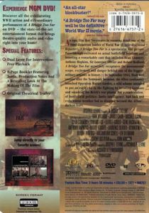 | An epic film that "re-creates in stunning detail one of the most disastrous battles of World War II" ('The Hollywood Reporter'), 'A Bridge Too Far' is a spectacular war picture. Painstakingly recreated on actual battlefield locations and boasting a remarkable cast that includes Sean Connery, Anthony Hopkins, Sir Laurence Olivier and Robert Redford, 'A Bridge Too Far' accurately recaptures the monumental scope, excitement and danger behind one of the biggest military gambles in history. In September 1944, flush with success after the Normandy Invasion, the Allies confidently launched Operation Market Garden, a wild scheme intended to put an early end to the fighting by invading Germany and smashing the Reich's war plants. But a combination of battlefield politics, faulty intelligence, bad luck and even worse weather led to disaster beyond the Allies' darkest fears. |