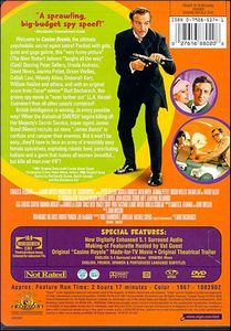 | Welcome to 'Casino Royale', the ultimate psychedelic secret agent satire! Packed with girls, guns and gags galore, this "very funny picture" (The New Yorker) delivers "laughs all the way" (Cue)! Starring Peter Sellers, Ursula Andress, David Niven, Joanna Pettet, Orson Welles, Daliah Lavi, Woody Allen, Deborah Kerr, William Holden and others, and with an original score from Oscar winner Burt Bacharach, this groovy spy movie is "even farther out" (L.A. Herald Examiner) than all other spoofs combined!British Intelligence is waning... in every possible way! When the diabolical SMERSH begins killing off Her Majesty's Secret Service, super-agent James Bond (Niven) recruits six more "James Bonds" to confuse and conquer their enemies. But it won't be easy... they'll have to face an army of irresistibly sexy female operatives, exploding robotic fowl, parachuting Indians and a germ that makes all women beautiful... but kills all men over 4'6"! |