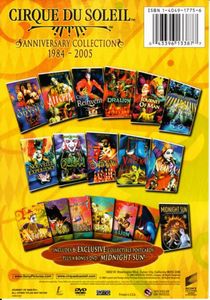 | Cirque du Soleil's Anniversary Collection 1984-2005 is a 12-disc retrospective of the Canadian troupe's distinctive brand of performance, involving the fantastic feats of acrobatics and athleticism, balance and contortion; the single-ring techno circus; the multicolored lights and costumes; the abstract story lines of fantasy and self-discovery; the music that fuses rock, New Age, and various world influences; and the madcap clowns that prey on their live audiences. The programs included are La Magie Continue (1986); Cirque Reinvente (1989); Nouvelle Experience (1991); Saltimbanco (1994), the 1994 documentary retrospective A Baroque Odyssey; the Amsterdam-set Quidam (1999); Allegria (1999), the live Sydney show; the Chinese-influenced Dralion (2000), in its standard, non-Superbit release; the relatively short IMAX film Journey of Man (2002); Varekai (2002), from Toronto; La Nouba (2003), from Walt Disney World; and Midnight Sun, strikingly staged outdoors at the 2004 Montreal International Jazz Festival.That's a lot of aerial feats, tricks, and tumbling, but the set is not designed to absorb in one sitting. Rather, viewers can sample both the simpler early shows and the stunning later performances that, with their 5.1 sound and widescreen pictures, are perfectly suited to home theaters. Compiling 12 previously released DVDs in space-saving Thinpaks at an economical price, the Anniversary Collection is nearly all the Cirque du Soleil you could ever want, but completists should note that the set does not include the feature film Allegria: An Enchanting Fable, the bonus disc of Varekai, the reality-TV show Fires Within, and the 13-part variety series Solstrom. --David Horiuchi Product DescriptionThis anniversary collection celebrates the achievements of the world renowned Cirque du Soleil. The collection includes 11 Cirque du Soleil productions plus a bonus DVD of Midnight Sun, a once-in-a-lifetime special event captured on DVD. The title within this colorful collection are: A Baroque Odyssey, Allegria, Cirque Reinvente, Dralion, Journey of Man, La Magie Continue, Nouvelle Experience, Quidam, Saltimbanco, Varekai, and La Nouba. |