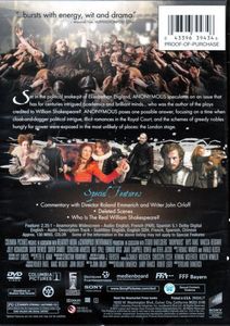 | Set in the political snake-pit of Elizabethan England, ANONYMOUS speculates on an issue that has for centuries intrigued academics and brilliant minds... who was the author of the plays credited to William Shakespeare? ANONYMOUS poses one possible answer, focusing on a time when cloak-and-dagger political intrigue, illicit romances in the Royal Court, and the schemes of greedy nobles hungry for power were exposed in the most unlikely of places: the London stage. |