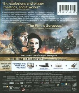 | A band of determined Russian soldiers fight to hold a strategic building in their devastated city against a ruthless German army, and in the process become deeply connected to a Russian woman who has been living there. In Stalingrad, directed by Fedor Bondarchuk, the scale of the battle contrasts dramatically with the human drama of the Russian soldiers, the few remaining civilians and their invaders into Stalingrad. |