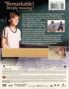 | Just imagine. You do a favor that really helps someone and tell him or her not to pay it back, but to pay it forward to three more - and on and on into a global outpouring of kindness and decency. Impossible? Junoir high student Trevor McKinney won't accept that.Haley Joel Osment plays Trevor, who starts a chain reaction of goodness for his social studies project in this bittersweet and uplifting talk directed by Mimi Leder ('Deep Impact'), based on the novel by Catherine Ryan Hyde and also starring Academy Award® winners Kevin Spacy and Helen Hunt. How much impact can one heartfelt idea have? Do yourself a favor and find out: see 'Pay it Forward'. |