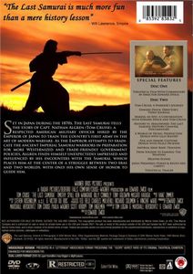 Commentary by Director Edward Zwick History Channel Documentary History vs. Hollywood: The Last Samurai Tom Cruise: A Warriors Journey Edward Zwick: Director's Video Journal Making an Epic: A Conversation with Edward Zwick and Tom Cruise A World of Detail: Production Design with Lilly Kilvert Silk and Armor: Costume Design with Ngila Dickson Imperial Army Basic Training From Soldier to Samurai: The Weapons Deleted Scenes Japan Premieres DVD-ROM PC Web Link Theatrical Trailer |