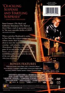 | Sean Connery ('The Rock') and Catherine Zeta-Jones ('The Mask of Zorro') blaze a trail of spectacular action in "the most enjoyable thriller of 1999!" (SRN RADIO NETWORK)When a priceless Rembrandt is stolen in New York, the evidence points to a solitary master thief (Connery), who is about to meet the insurance company's most cunning - and seductive - investigator (Zeta-Jones). Following a nerve-racking game of cat and mouse, the two join forces...or so it seems...to attempt a daring multibillion-dollar heist tied to the dawn of the new millennium. |