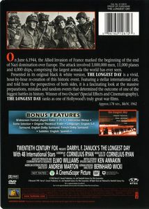 | On June 6, 1994, the Allied Invasion of France marked the beginnig of the end of Nazi domination over Europe. The attack involved 3,000,000 men, 11,000 planes and 4,000 ships, comprising the largest armada the world has ever seen.Presented in its orginal black & white version, THE LONGEST DAY is a vivid, hour-by-hour re-creation of this historic event. Featuring a stellar international cast, and told from the perspectives of both sides, it is a fascinating look at the massive preparations, mistakes and random events that determined the outcome of one of the biggest battles in history. Winner of two Oscars® (Special Effects and Cinematography), THE LONGEST DAY ranks as one of Hollywood's truly great films. |