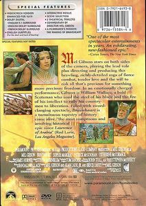 | Mel Gibson stars on both sides of the camera, playing the lead role plus directing and producing this brawling, richly-detailed saga of fierce combat, tender love and the will to risk all that's precious for something more precious: freedom. In an emotionally charged performance, Gibson is William Wallace, a bold Scotsman who used the steel of his blade and the fire of his intellect to rally his country-men to liberation. Filled with sword-clanging spectacle, 'Braveheart' is a tumultuous tapestry of history come alive, "the most sumptuous and involving historical epic since 'Lawrence of Arabia' " (Rod Lurie, 'Los Angeles Magazine'). |