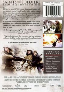 | Based on actual WW II events, Saints and Soldiers tells the dramatic story of a small band of Allied soldiers trapped behind enemy lines with information that could save thousands of American lives. Outgunned and ill-equipped, they must battle the frigid wilderness and roving German troops to smuggle critical intelligence back to Allied territory.In addition to winning 14 Best Picture Awards at film festivals nationwide, critics and audiences have showered Saints and Soldiers with praise, making it one of the most acclaimed films of 2004. |