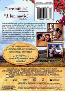 | From the studio who broght you 'Sweet Home Alabama' comes the extraordinary romantic comedy starring Academy Award nominee Diane Lane. Based on the #1 New York Times best-selling book, 'Under the Tuscan Sun' follows San Francisco writer Frances Mayes (Lane) to Italy as a good friend offers her a special gift - ten days in Tuscany. Once there, she is captivated by its beauty and warmth, and impulsively buys an aging, but very charming villa. Fully embracing new friends and local color, she finds herself immersed in a life-changing adventure filled with enough unexpected surprises, laughter, friendship and romance to restore her new home - and her belief in second chances. |