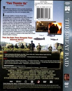 | The Miramax Collector's Series proudly presents the Exclusive Unrated Director's Cut of this powerful motion picture applauded by critics and moviegoers alike.In the epic tradition of 'Saving Private Ryan', 'The Great Raid' is an inspirational true story of the most triumphant rescue mission in U.S. military history! As World War Two rages, the elite 6th Ranger Battalion is given a mission of heroic proportions: push 30 miles behind enemy lines and liberate over 500 American prisoners of war. Under the command of Lt. Col. Henry Mucci (Benjamin Bratt, 'Traffic'), the men of the 6th will face the unthinkable by attempting the impossible! Also featuring James Franco ('Spider-Man 1 & 2'), Connie Nielsen ('Gladiator') and Joseph Fiennes ('Shakespeare In Love'), this gripping big-screen hit captures a moment in time when men of honor became soldiers of destiny! |